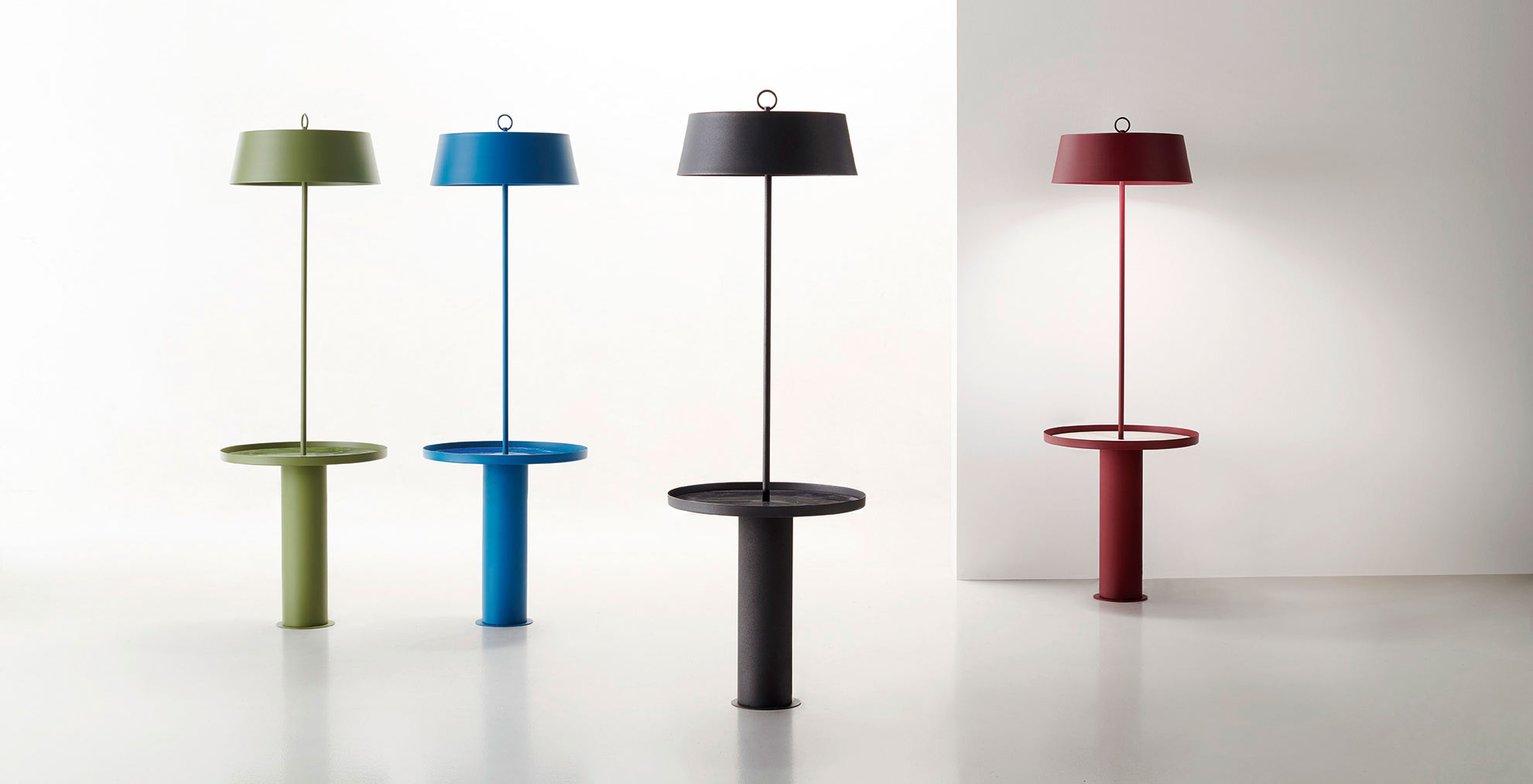 Lampada da terra Totò Riflessi . Piantana con struttura in metallo verniciato rubino, grafite, blu mare, verde salvia e champagne perlato, particolare il tavolino incorporato Ø 50 cm e piano interno in ceramica nelle finiture: Bianco Statuario lucido o bocciardato opaco, Calacatta Oro lucido o opaco, Noir Desir lucido o opaco, Verde Borgogna opaco o lucido, Sodalite Blu lucido, Capraia lucido.
