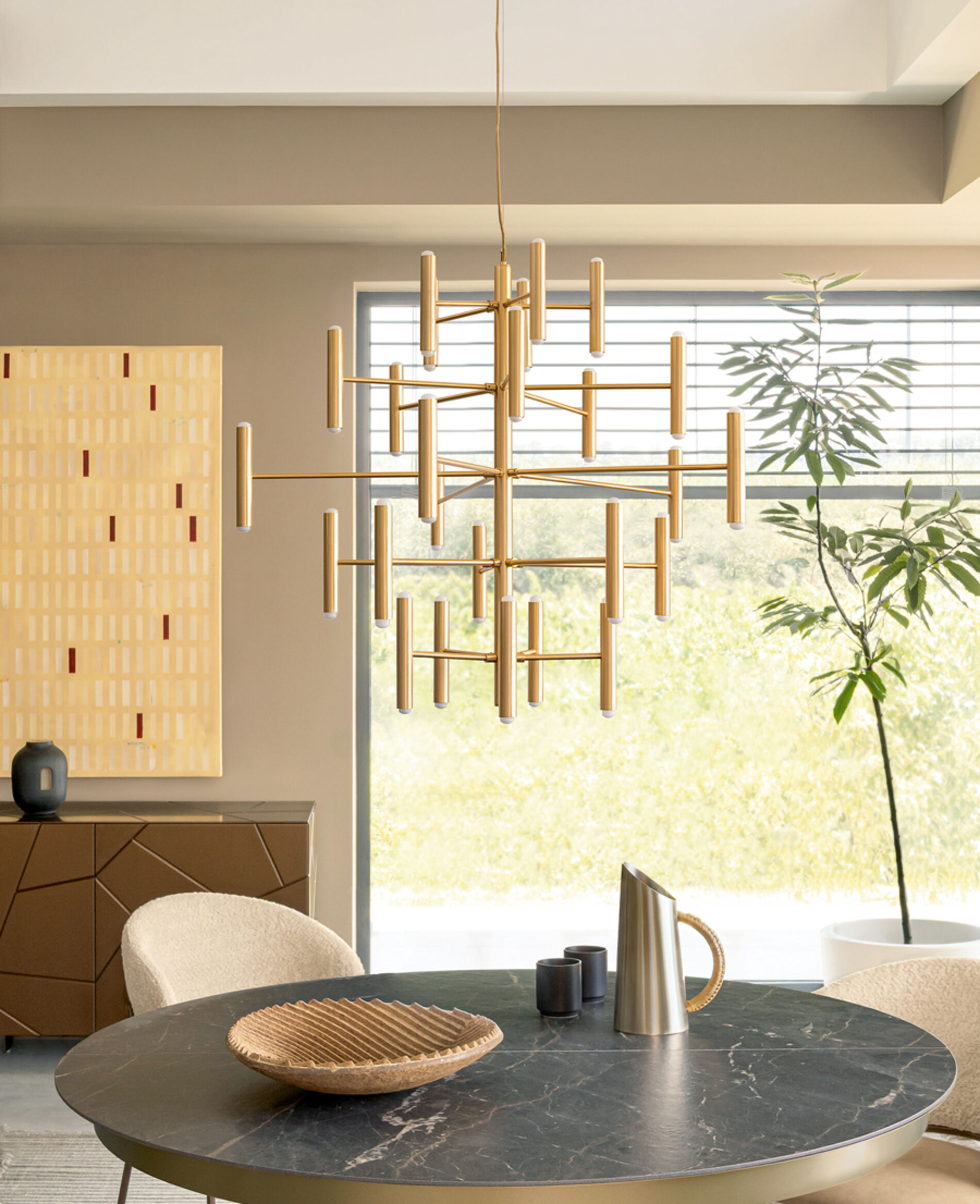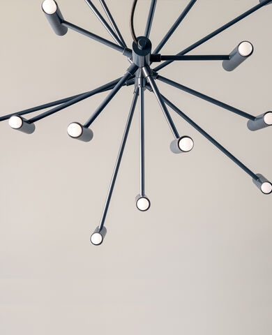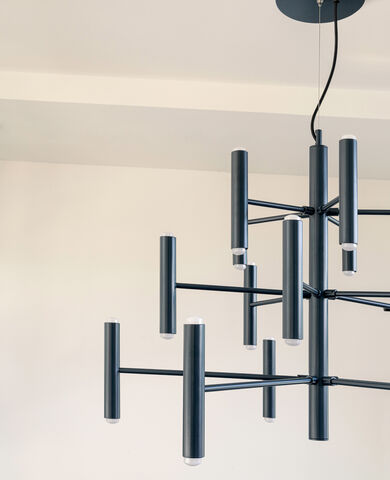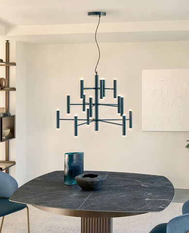 Lampada sospensione Charme Riflessi . Particolare forma geometrica molto contemporanea , struttura in metallo con moduli cilindrici disponibile in diverse finiture e colori . i diffussori a forma cilindrica generano molta luce diffusa e calda . I particolari in metallo sono verniciato e metallo verniciato galvanico , Inoltre i cavi elettrici sono in tessuto nero . La lampada Charme nella versione a sospensione è disponibile nelle seguenti misure : larghezza cm 70 con 30 lampadine e larghezza cm 100 con 50 lampadine . Le lampadine sono incluse nel prezzo .