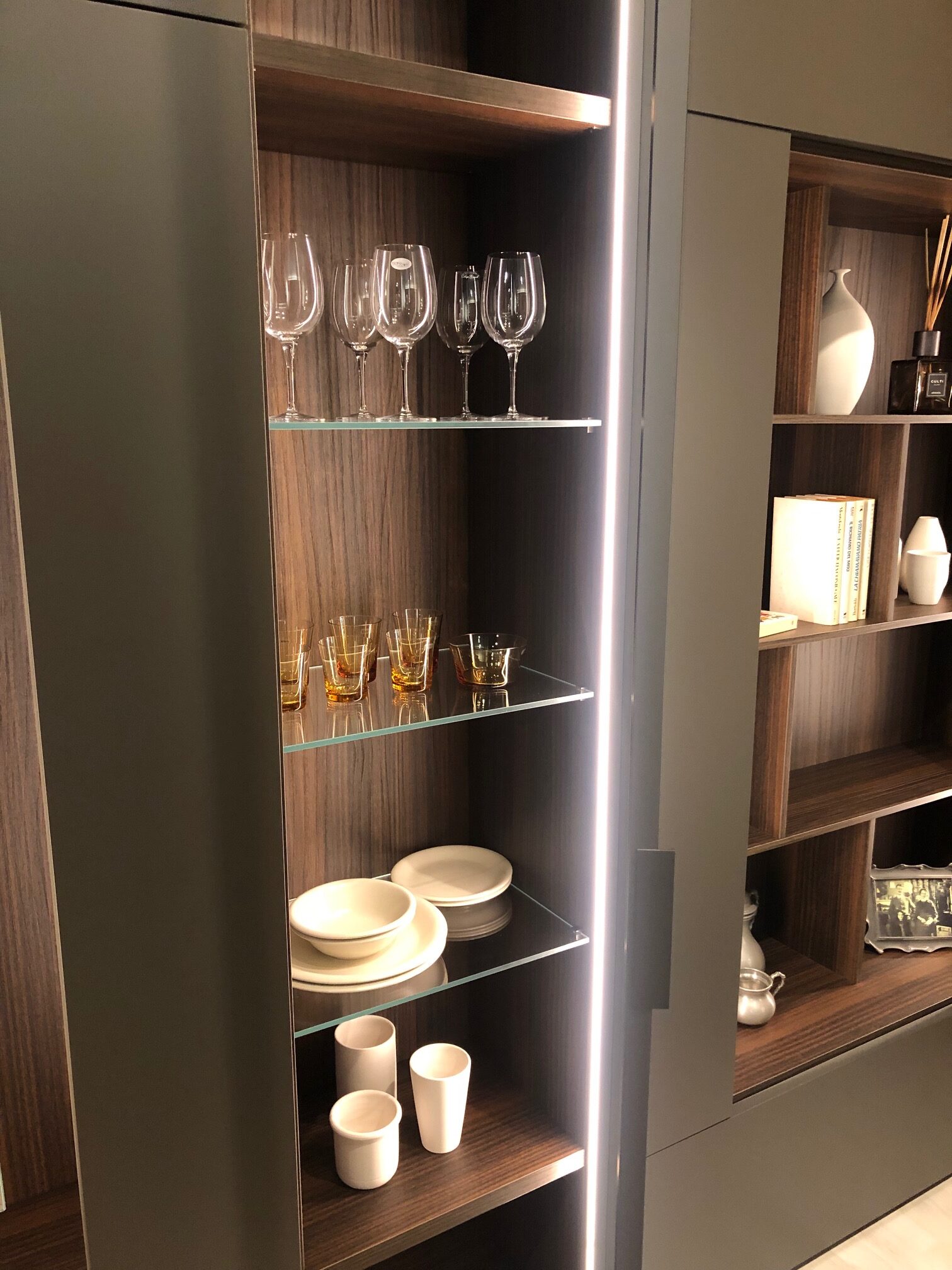 Mobile Roomy Caccaro outlet con ante ad apertura ribalta e cestoni . Offerta per rinnovo esposizione sconto outlet . Mobile Caccaro composizione parete con anta in cristallo trasparente extrachiaro e ante finitura laccato opaco Ombra , schiene finitura Easy eucalipto , completamente attrezzato con ripiani , accessori interni , illuminazione led , cestoni e ante ribalta . Composizione mobile ingresso Roomy vano terminale con seduta . Le dimensioni sono : larghezza cm 402.5 , altezza 263,3 e profondità cm 42,7 . Prezzo di listino € 10.068,00 offerta outlet sconto 40% € 6.040,00 , l’offerta è iva compresa incluso il trasporto e montaggio in Torino e cintura , per altre zone richiedere informazioni .